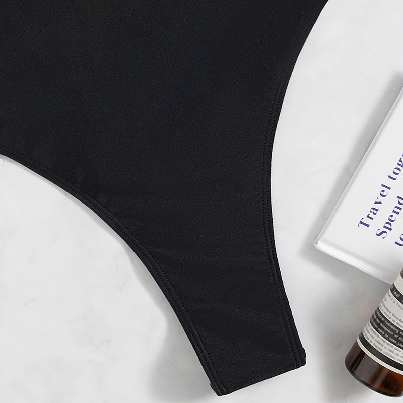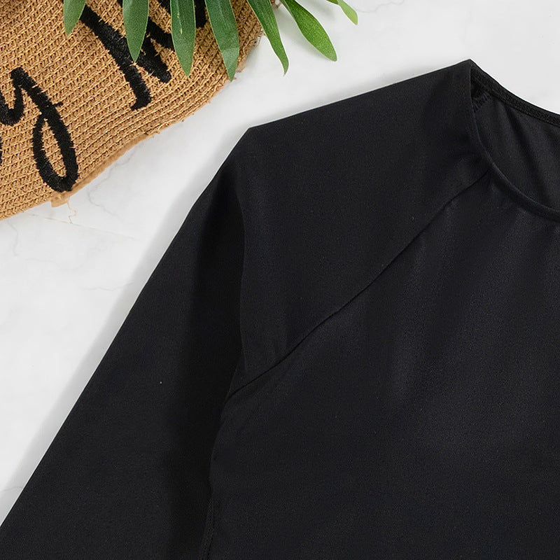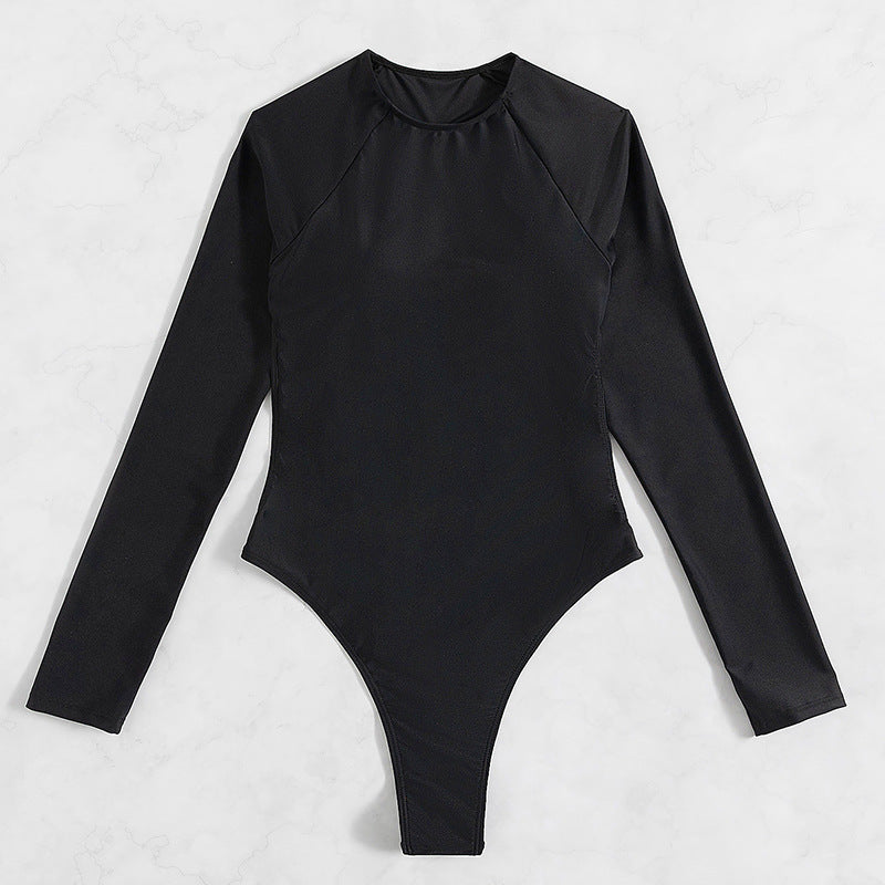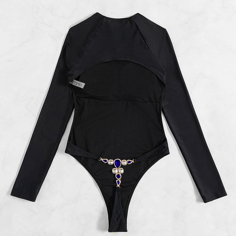 Baddräkt dam – långärmad one piece med öppen rygg, T-back & strassdetaljer