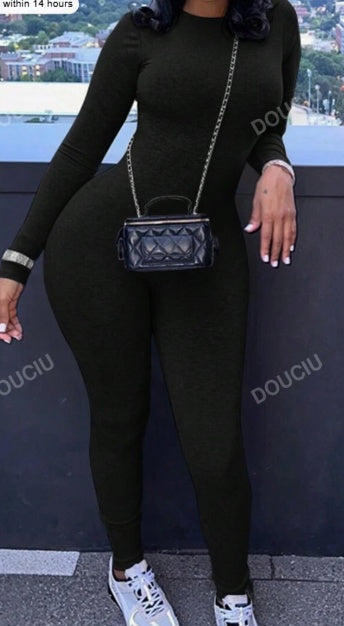 Jumpsuit dam – enfärgad ribbstickad byxdress med rund hals & lång ärm för vår & höst