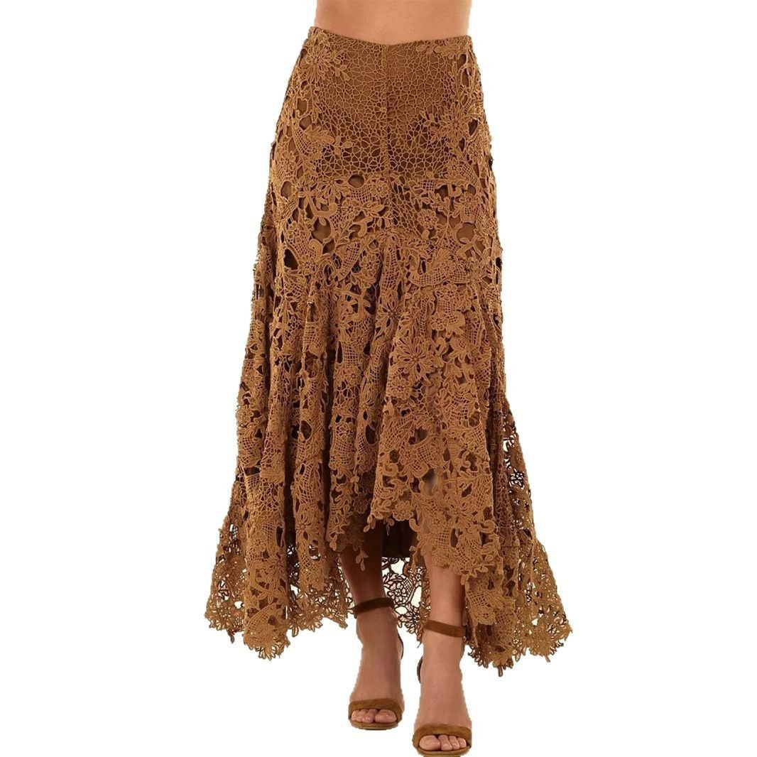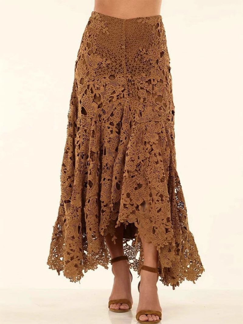 Skapa en modern och självsäker look med denna asymmetriska kjol i khaki. Den unika designen med spetsdetaljer och hålmönster ger en trendig streetkänsla samtidigt som den är lätt att bära till både vardag och kväll. En perfekt balans mellan stil och edge för dig som vill sticka ut.